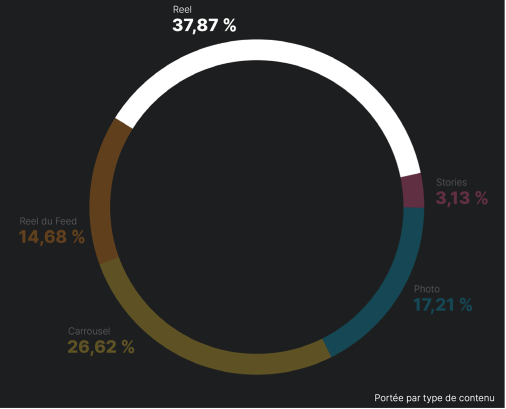 Tu le sais déjà, le Reel est LE format qui explose sur Instagram. Il te permet d’attirer de nouveaux abonnés, et de propulser ton compte au niveau supérieur, car le Reel est le format qui a la meilleure portée avec 37% de tous les contenus, c'est donc lui que tu dois utiliser si tu veux toucher des non abonnés.